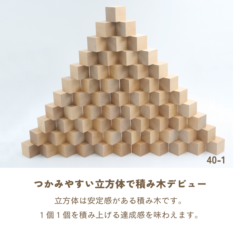 立方体は安定感がある積み木なので、1個1個を積み上げる達成感を味わえます。