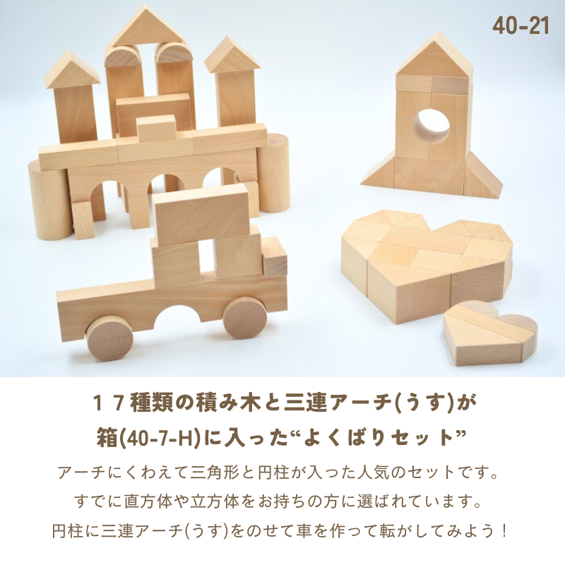 17種類の積み木と三連アーチ(うす)が箱(40-7-H)に入った“よくばりセット”です。
