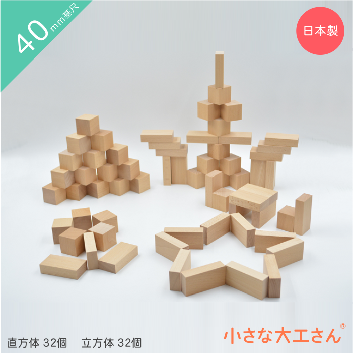 【40mm基尺】40-ABハーフ 基本の積み木 直方体 32個 と 立方体 32個のセット