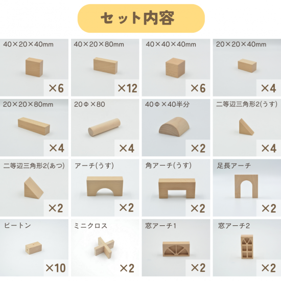 *「40×20×40mm」とは、積み木の寸法(幅40mm×厚み20mm×長さ40mm)を表しています。